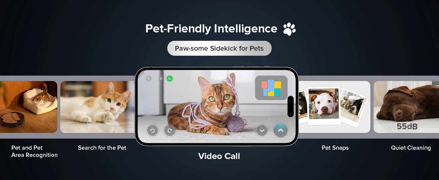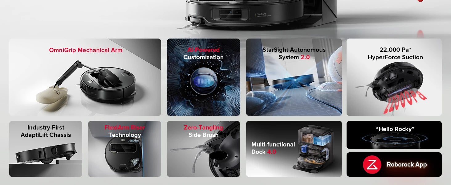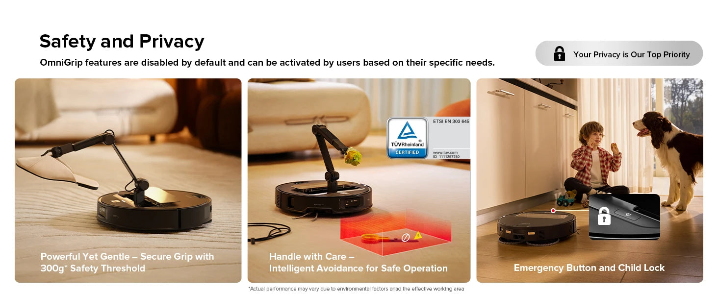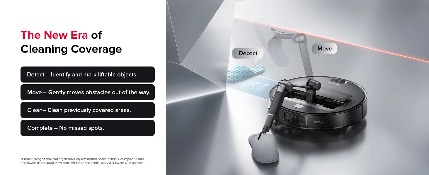 Experience the robotic vacuum with a five-axis mechanical arm. The OmniGrip arm moves obstacles, lifts objects, and even organizes small household items like socks and tissues. Equipped with dual cameras, LED lighting, and precision sensors, it ensures accurate object handling. The arm features a gentle-grip design and a built-in weight sensor to prevent excessive squeezing, capable of handling objects up to 300g with ease
