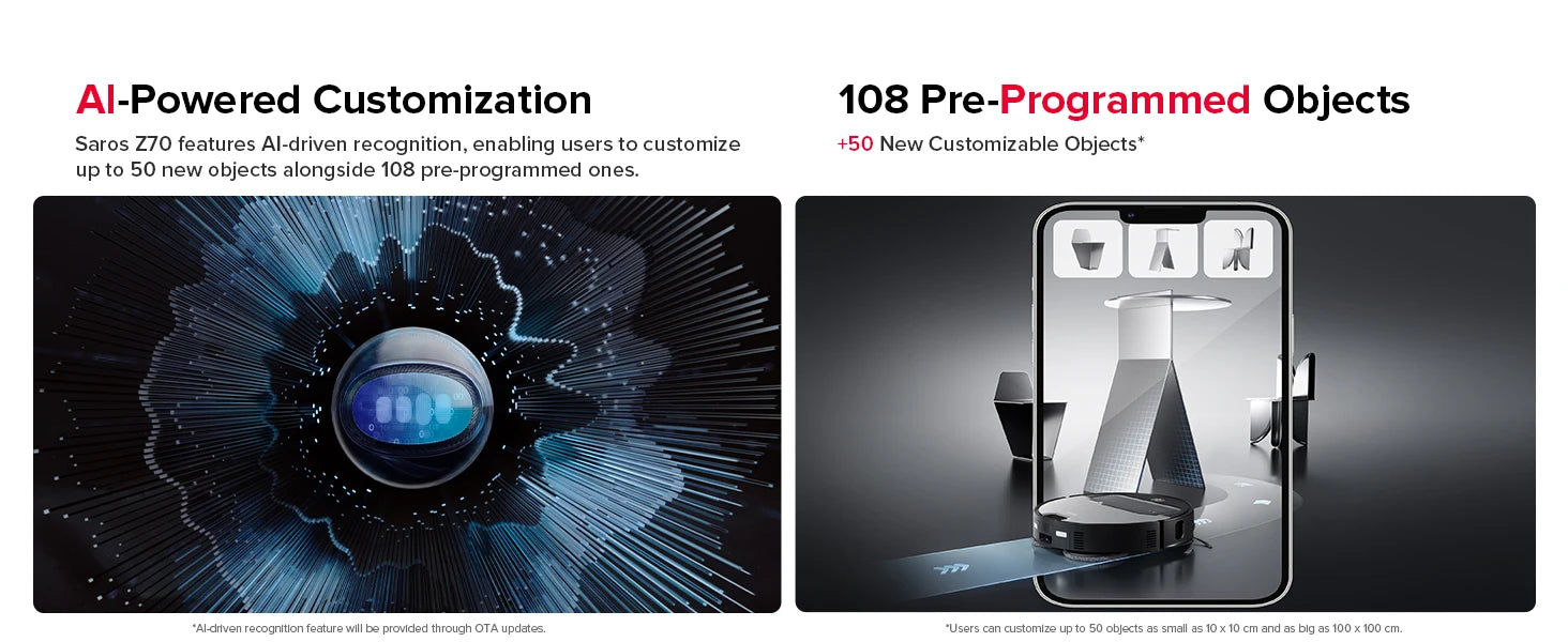 Beyond its pre-programmed 108 object* recognition, the Z70 allows users to define and label up to 50 new objects* in the Roborock app for a fully personalized experience. An AI-driven recognition feature will be provided through OTA updates