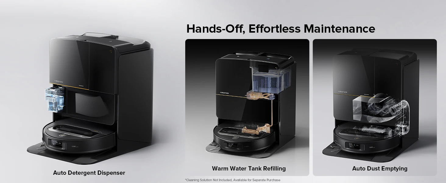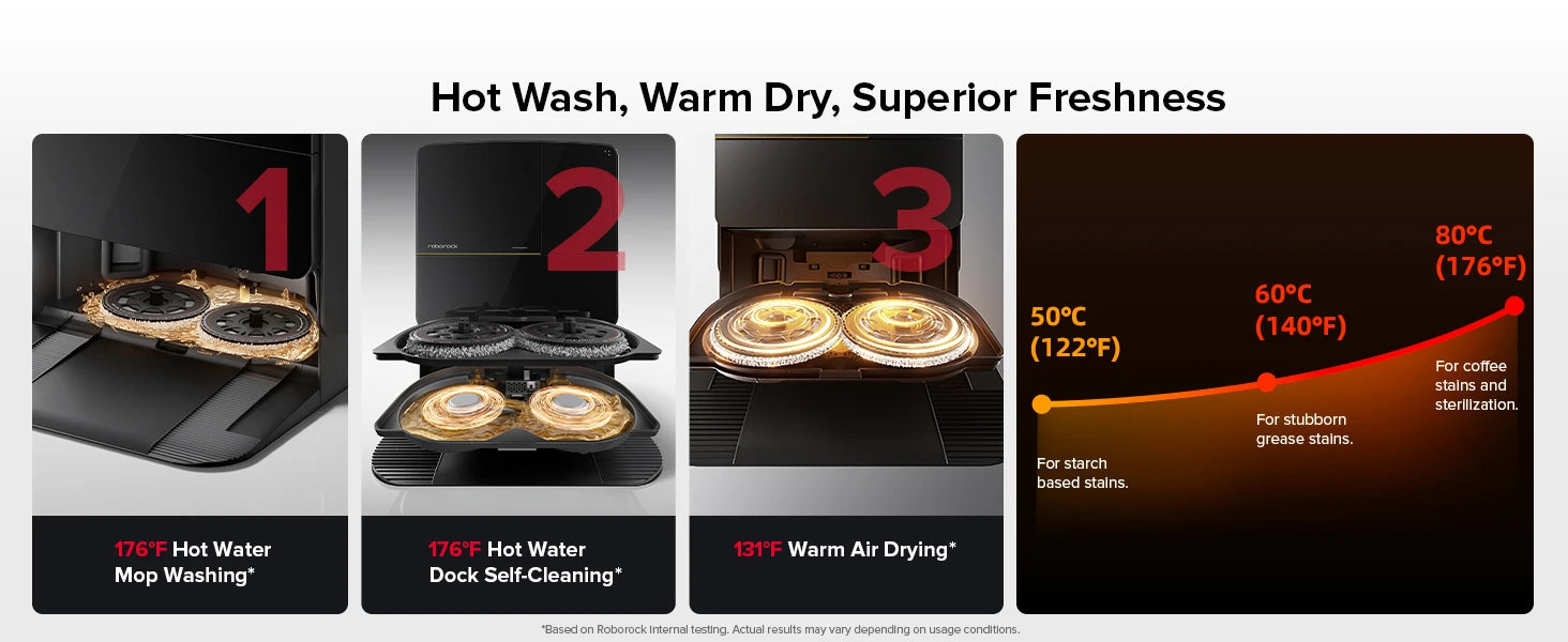 The dock features 176°F hot water mop washing*, 176°F hot water dock self-cleaning*, automatic mop removal, auto detergent dispensing, smart re-wash & re-mop , and 131°F warm air drying* to keep your vacuum and dock hygienic. Plus, the auto dust emptying function provides up to 7 weeks* of hands-free cleaning