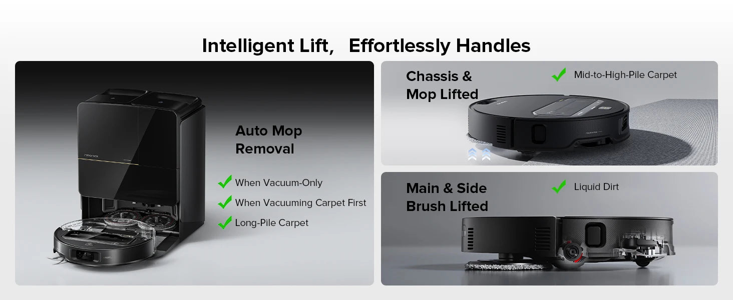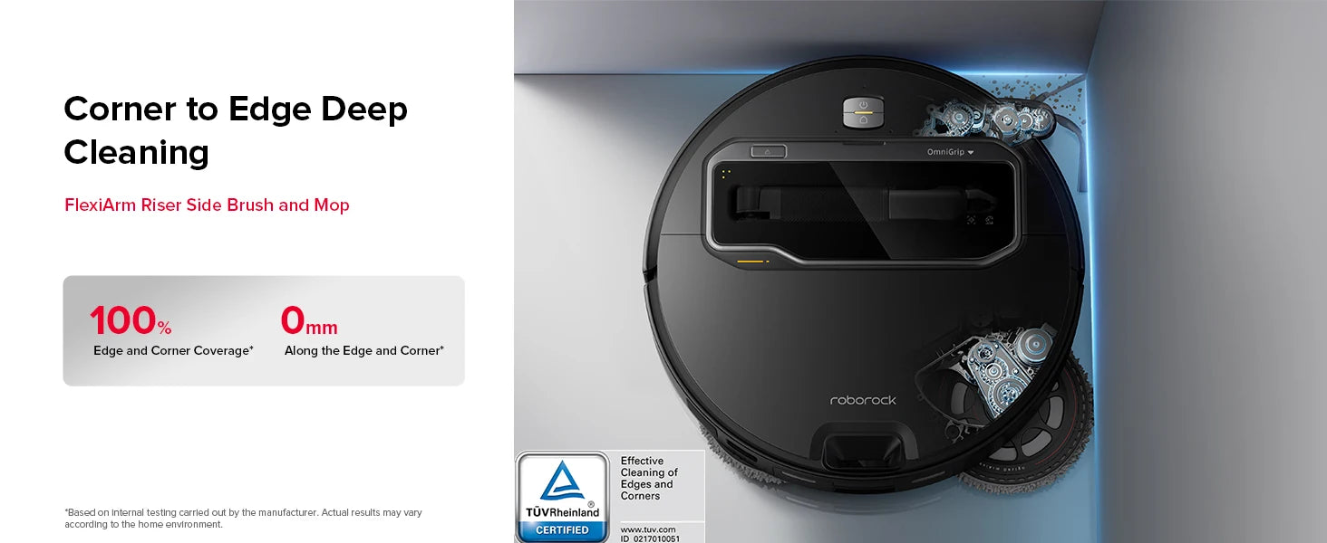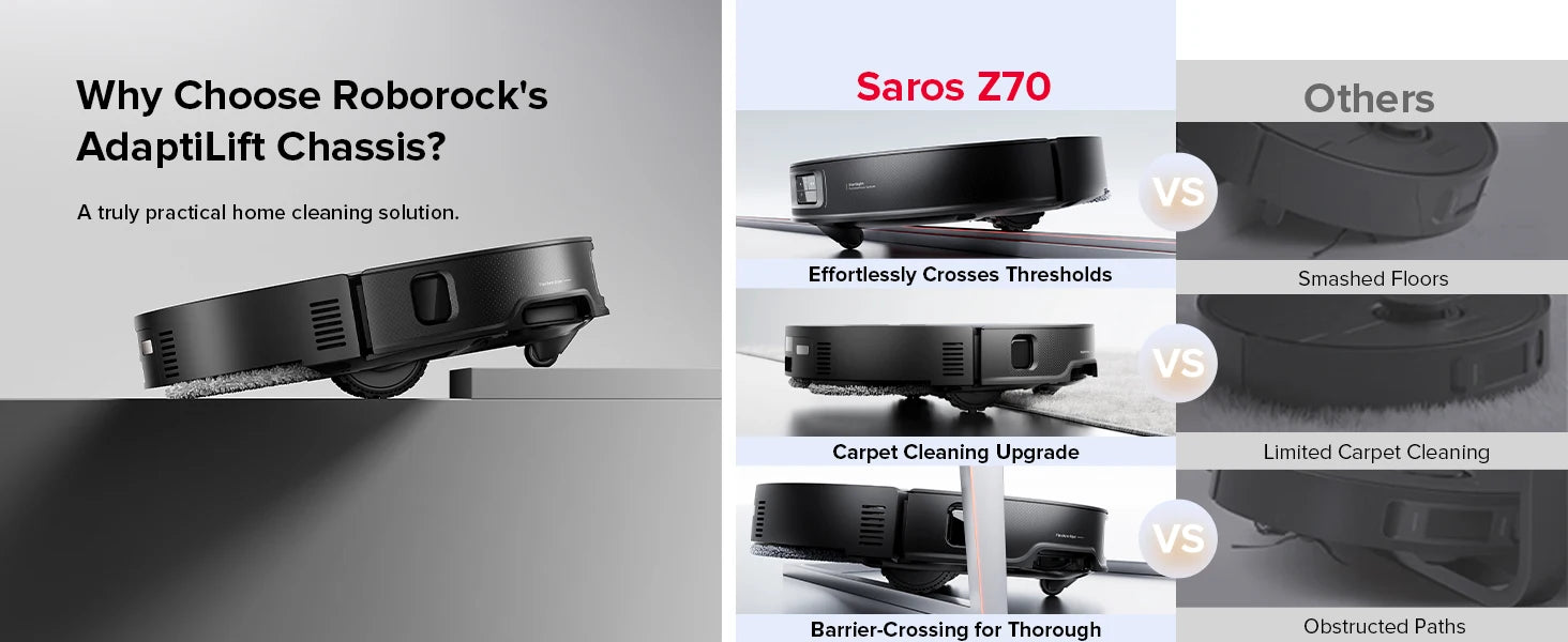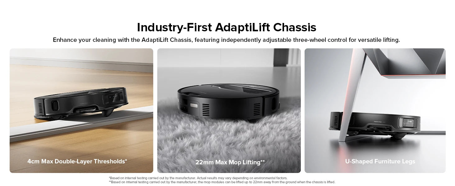 Forget pre-cleaning! The Saros Z70 detects, marks, and lifts obstacles in its first pass, returning to clean previously blocked areas. With its FlexiArm Riser Side Brush and Mop, it reaches deep into corners and edges, ensuring 100% floor coverage*. The AdaptiLift Chassis automatically adjusts to different surfaces, climbing thresholds up to 4cm* and lifting its mop up to 22mm* on carpets
