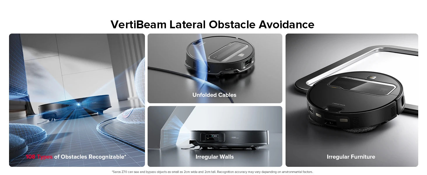 The Saros Z70 features the advanced StarSight Autonomous System 2.0, providing smart navigation and obstacle avoidance. Its VertiBeam Lateral Obstacle Avoidance technology enables the robot to accurately detect and navigate around obstacles like furniture legs, cables, and up to 108 other types of obstacles*. This ensures precise movement in complex layouts, delivering thorough and reliable cleaning coverage even in challenging environments